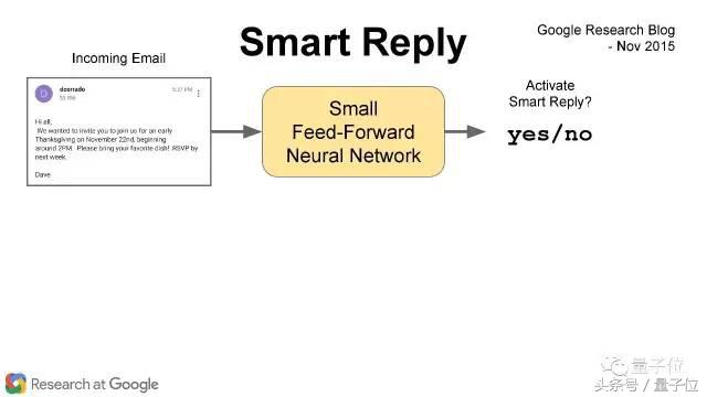 举个例子,这是我发给同事们的一封邮件,问大家要不要参加感恩节聚会。这种邮件只需要简短的回复,有了Smart Reply用户只需要选择“是”或者“否”。