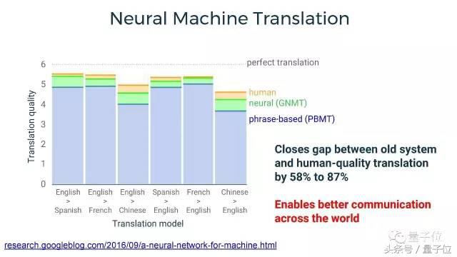 上图显示了人类和Google的两种机器翻译模型的翻译质量。蓝色表示我们原来用的基于短语的机器翻译模型,绿色的是基于seq2seq的神经网络机器翻译模型,黄色的表示双语人类(非专业翻译)。