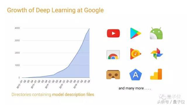 后来,我们把深度学习用到了更多领域,上图左侧是包含我们第一代和第二代(TensorFlow)深度学习框架模型描述文件的程序数量,我们和Google的其他团队合作,把深度学习用到各种产品之中。