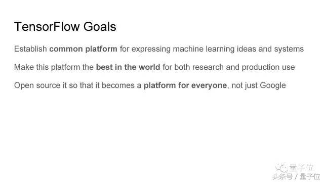 TensorFlow的目标是,建立一个呈现机器学习创意和系统的通用平台,并让这个平台在研究和生产环境中都成为世界最佳,再通过开源,让它成为所有人的平台,而不只是Google的。