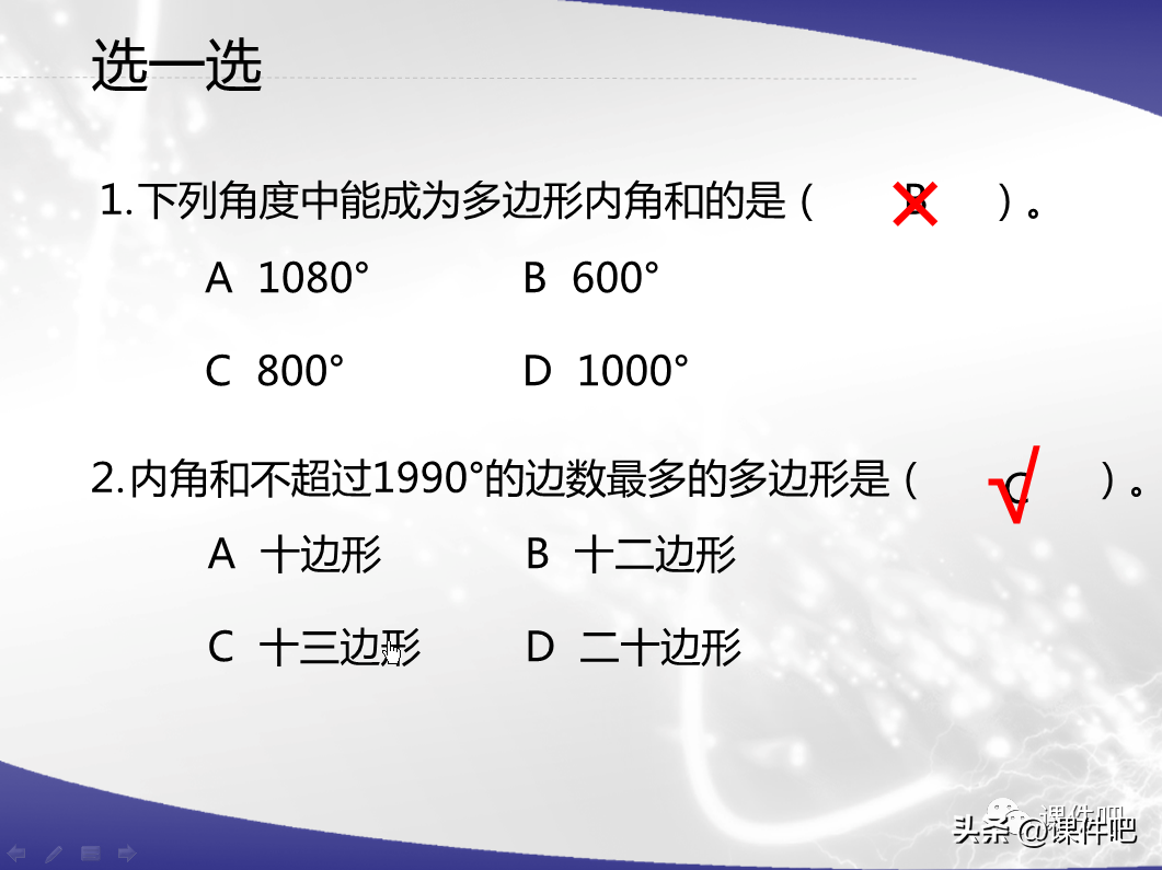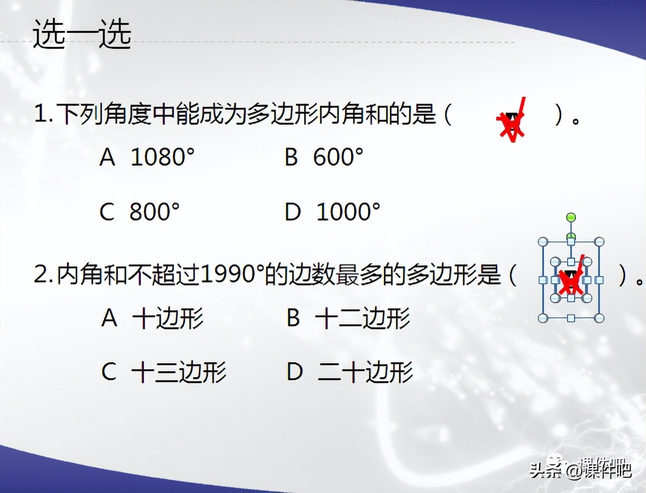 (3)将每一题的答案以及对勾和叉号放置在一起,如图3所示。至此,这张选择题幻灯片制作完成。放映幻灯片,单击相应的选项将能够显示选择的答案,对选择的正误进行判断,如图4所示。