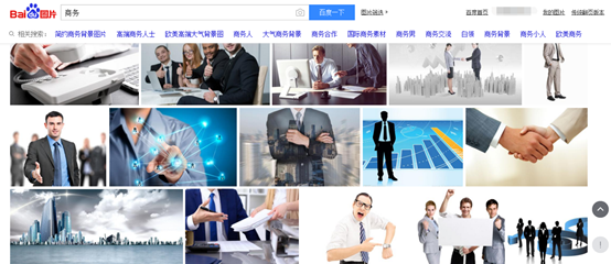 这两页PPT都是在一张大图上加入想要表达的文字,可是第二页却比第一页显得高端的多,究其原因,其实是配图在发挥作用。第一页的配图没有第二页考究,所以整体的格调就没有第二页那么高。那么我们到底应该去哪里找这些高逼格的配图呢?百度?在百度图片中输入“商务”我们得到以下结果: