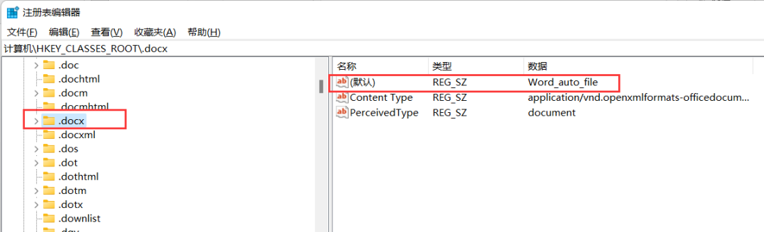 4、找到之后,点击docx,看到右侧有一个(默认),此时的默认值为Word_auto_file,如果不是该值也不要紧。
