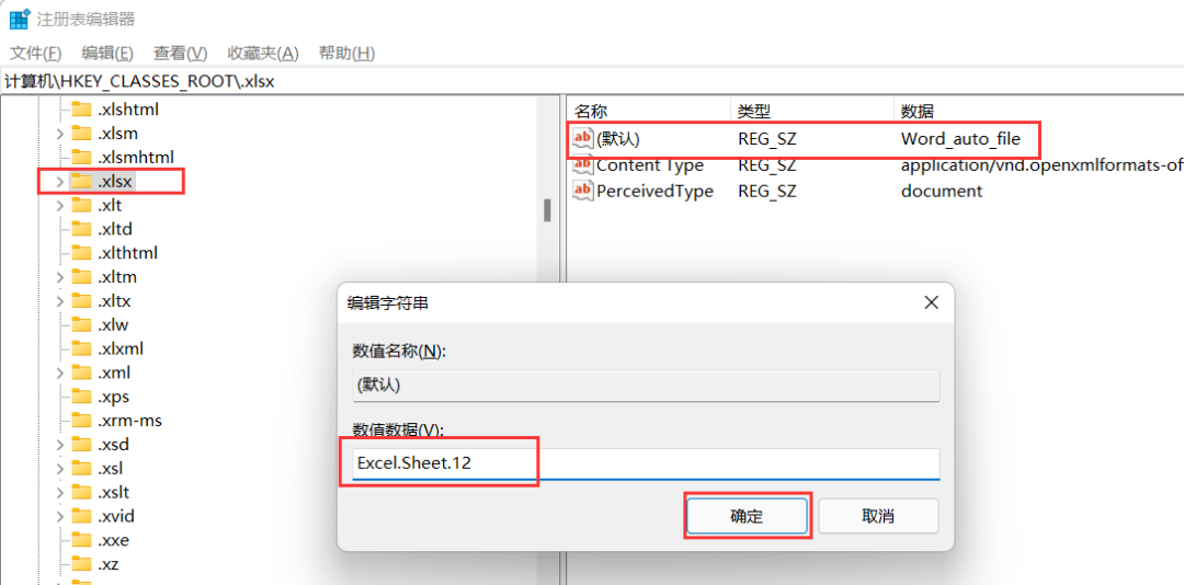 注册表寻找“xlsx”的位置,并将(默认)改为Excel.Sheet.12;