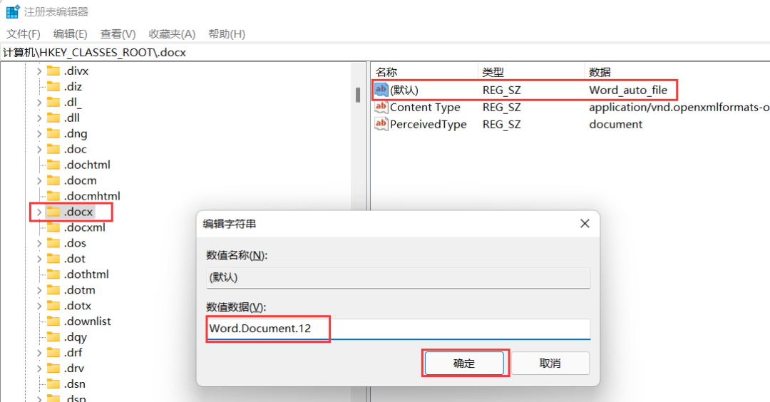 5、双击(默认)一项,将其改为 Word.Document.12,点击确定。