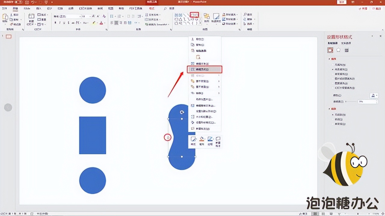 首先我们插入两个圆形和一个矩形,罗列到一起。选中矩形,鼠标右击选择“编辑顶点”,在矩形两侧拖拽出两个弧,选中三个图形,格式合并形状中,选择“结合”