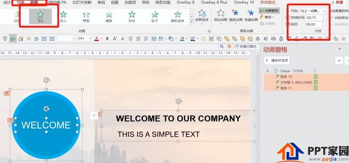 7.给圆、文本添加飞入动画-效果选项中选择你喜欢的进入方向-与上一动画同时-持续时间0.75。