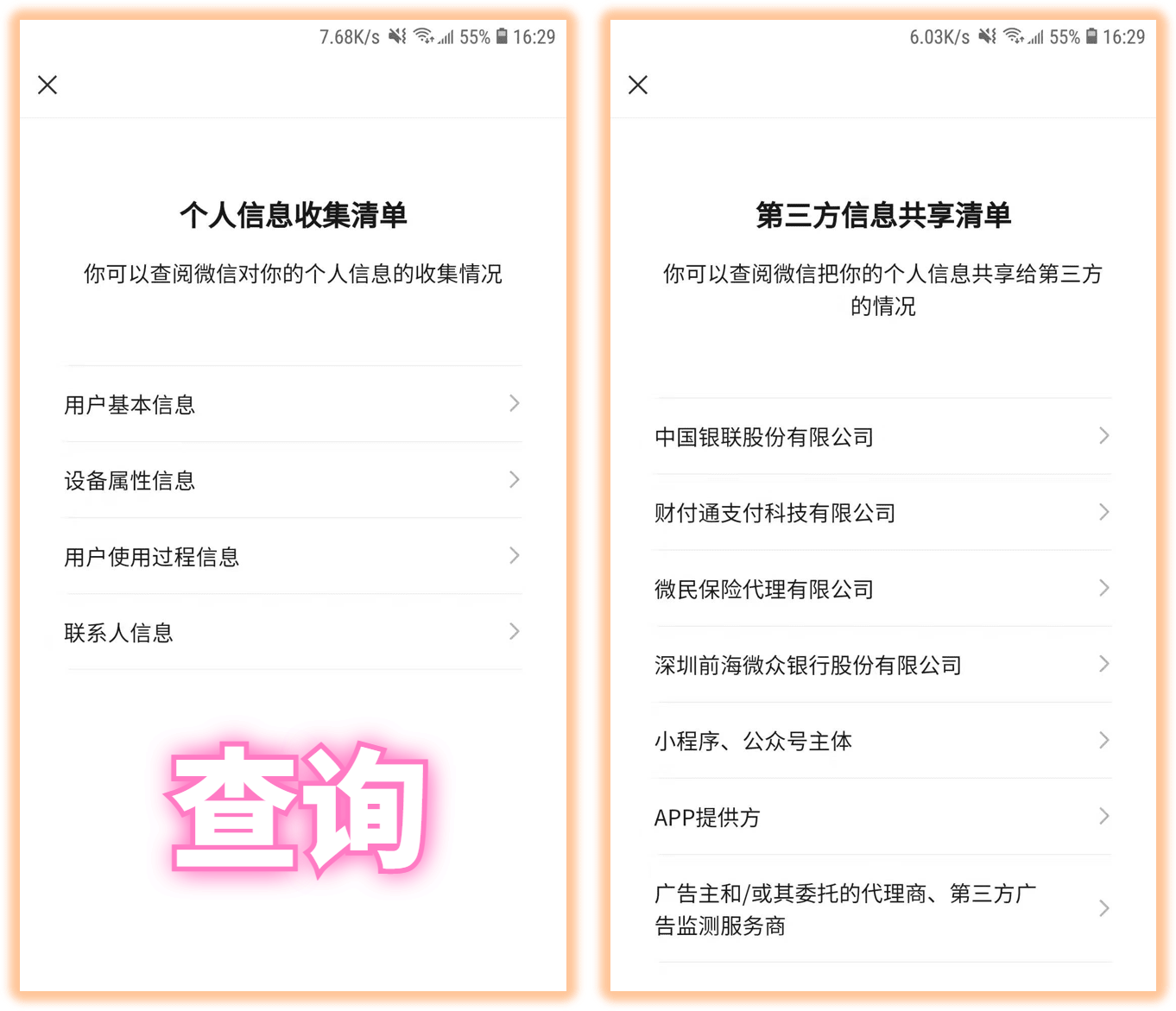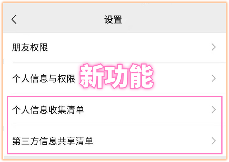在微信设置中,还新增了「个人信息收集清单」与「第三方信息共享清单」两个选项。