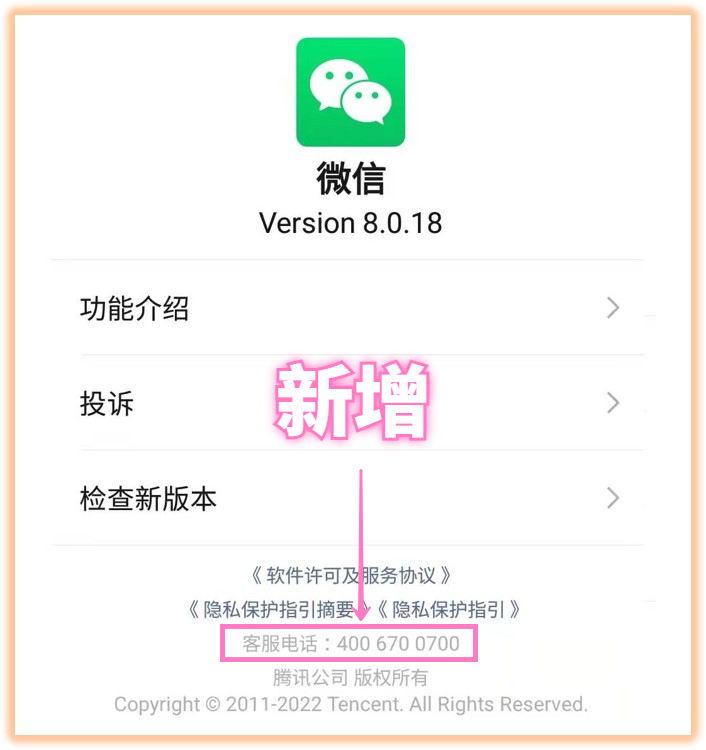 最后还有一个彩蛋,微信也有人工客服了,想不到吧!本次更新后,打开「我」-「设置」-「关于微信」,底部显示微信客服电话。