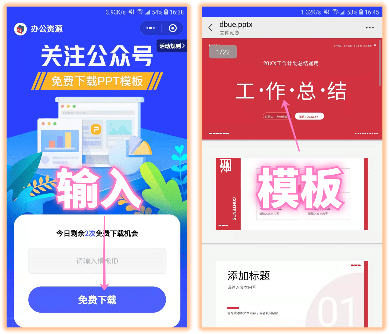 本次更新后,我意外的发现,原来微信上还能获取PPT模板,找到办公资源小程序,在里面输入模板ID,每天都能领取2套,真是太赞了。