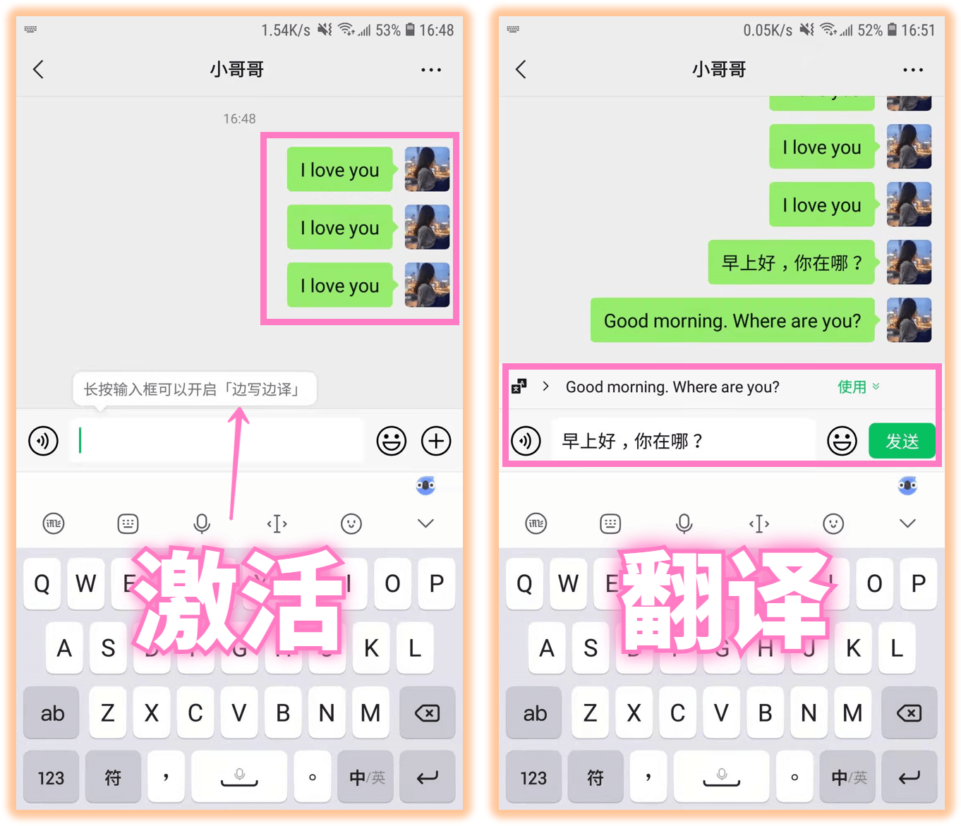 边写边译功能这次终于给安卓微信安排上了,只要在微信对话框中,连续输入三句英语,就可以开启这个功能,输入文本实时翻译成英文、韩语、日语等。