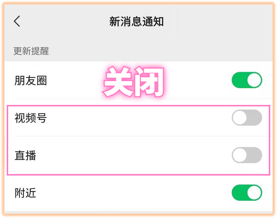 如果你平时只是聊聊天、刷刷朋友圈,不想有其他更新提醒,你可以进入微信「设置」-「新消息通知」,找到更新提醒,将视频号、直播关闭提醒。