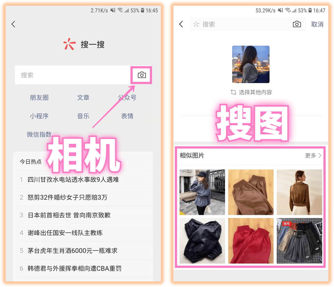 在搜一搜文本框末端,将“语音搜索”替换成了“图片搜索”,主要功能就是以图搜图,拍照上传图片,就能快速识别图片中的信息内容。