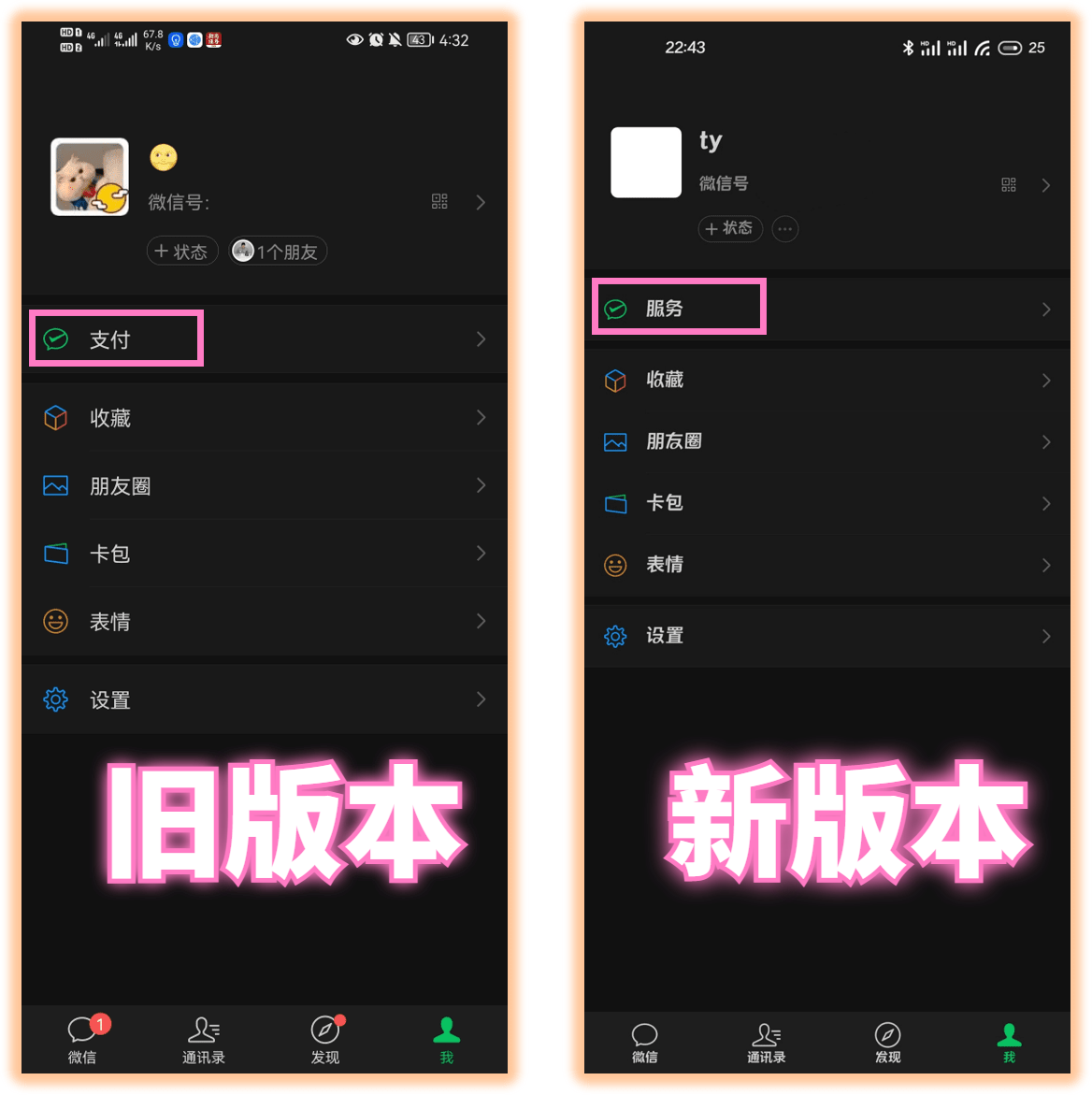 打开微信点击右下角的「我」,原来的「支付」被改为「服务」。毕竟里面有大量本地生活服务,而微信支付功能占比越来越小,改名也在情理之中。