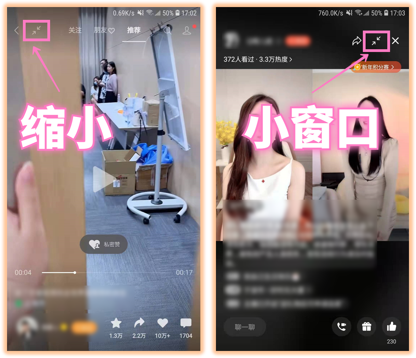 如果你经常在微信上刷视频、看直播,突然有好友发来消息,不得已退出视频和直播。在新版本中,视频左上角和直播间右上角,新增了缩放按钮,可以小窗口观看。