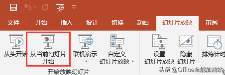 b、在【幻灯片放映】/【开始放映幻灯片】组中,单击“从当前幻灯片开始” 按钮。