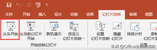 a、在【幻灯片放映】/【开始放映幻灯片】组中单击“从头开始”按钮。