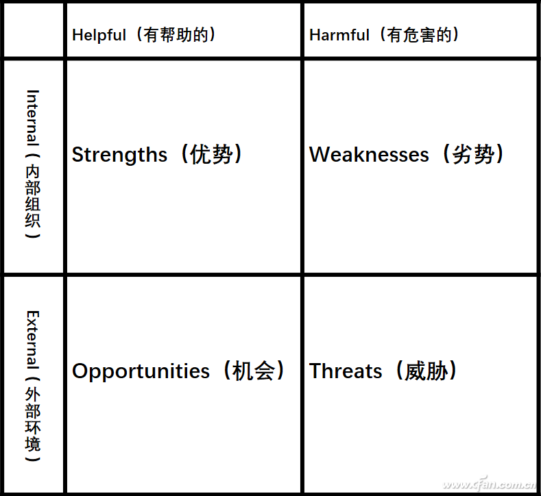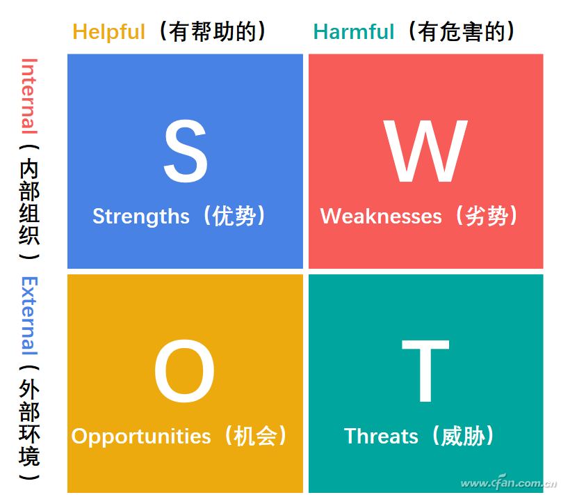 SWOT模型主要根据企业的内部和外部环境,找出企业自身的优势(Strengths)、劣势(Weaknesses)、机会(Opportunities)以及威胁(Threats)之所在,然后给出应对的方法。这一模型的名称正是由上述几个英文单词的首字母缩写而来。