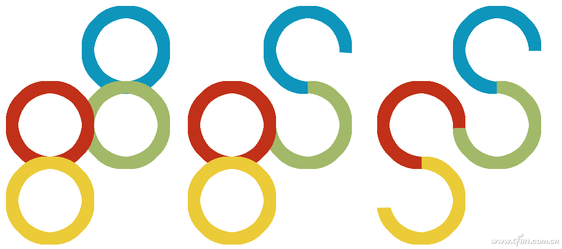 当然,PEST模型图还可以制作得更为复杂一些,下图就是很好的一例(图6)。这个图形的制作技巧,就在于将多个半圆进行无缝链接,这在PowerPoint中会有些麻烦,所以我们可以先借助第三方软件完成图形的初步效果,然后再导回PowerPoint中继续制作。这里以Photoshop CS5为例,分别绘制出四个圆形,每个圆形独占一个图层,然后将多余的部分删除就可以了(图7)。