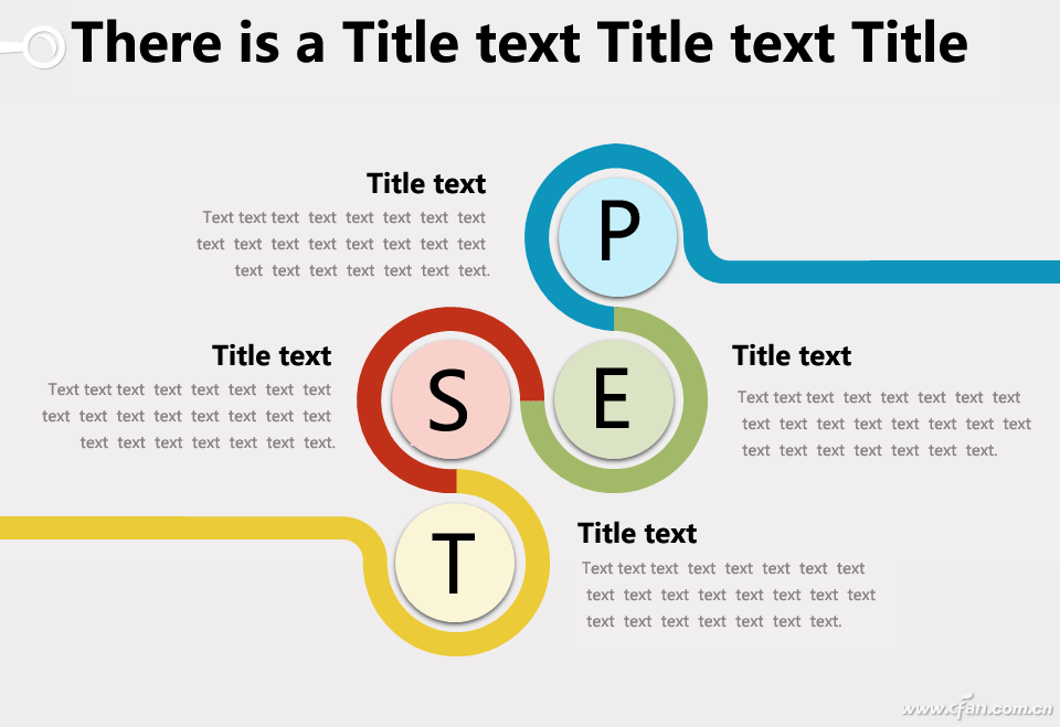 因为SWOT和PEST在形式上比较接近,这两者的图形常常可以互换的,比如将上例中的字母“PEST”替换成“SWOT”,也丝毫没有违和感。