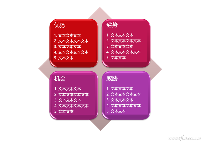许多企业经常要用到SWOT、PEST及波特五力等分析模型,由它们得出的分析结果一般会应用到PPT演示报告中。我们下面介绍的方法主要是对这几种模型图的修饰,使得它们更具有视觉冲击力,从而给观众留下更深刻的印象。