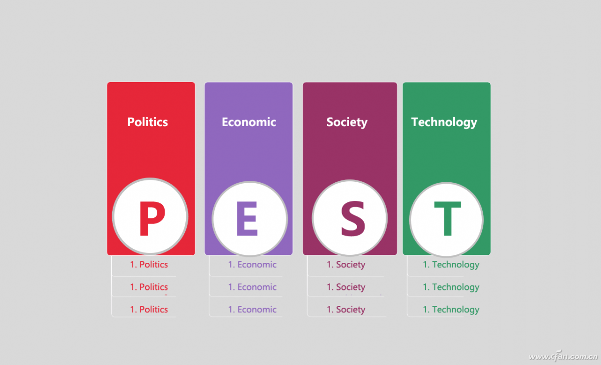 PEST模型从政治(Politics)、经济(Economic)、社会(Society)、技术(Technology)等四个方面切入,是对企业外部宏观环境的一种分析。PEST模型在图形表现形式上和SWOT模型比较接近,常常也是通过列表的形式来表现的(图5)。