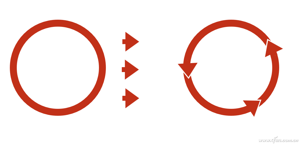 上图的制作,其实就是在一个圆形的上面加上箭头图标而已,但它使得整个图似乎转动起来。在PowerPoint中,首先绘制出圆形,然后再等矩离加上箭头形状就可以了。本例中箭头的制作有一个小技巧:首先绘制一个箭头,填充好颜色,然后将其复制一份,并将复制的箭头填充上白色,最后把两个箭头叠加在一起,略微错开点位置,即可为其添加立体感效果了(图9)。