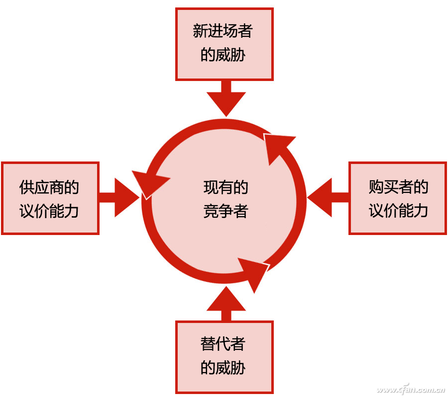 波特五力模型,是上世纪80年代初由迈克尔·波特(Michael Porter)提出来的,这一模型针对某一企业,解析供应商议价能力、购买者议价能力、潜在竞争者进入的能力、替代品的替代能力、行业内竞争者的竞争能力等五种力量,以及这五种力量将会给企业带来什么样的利润潜力变化。