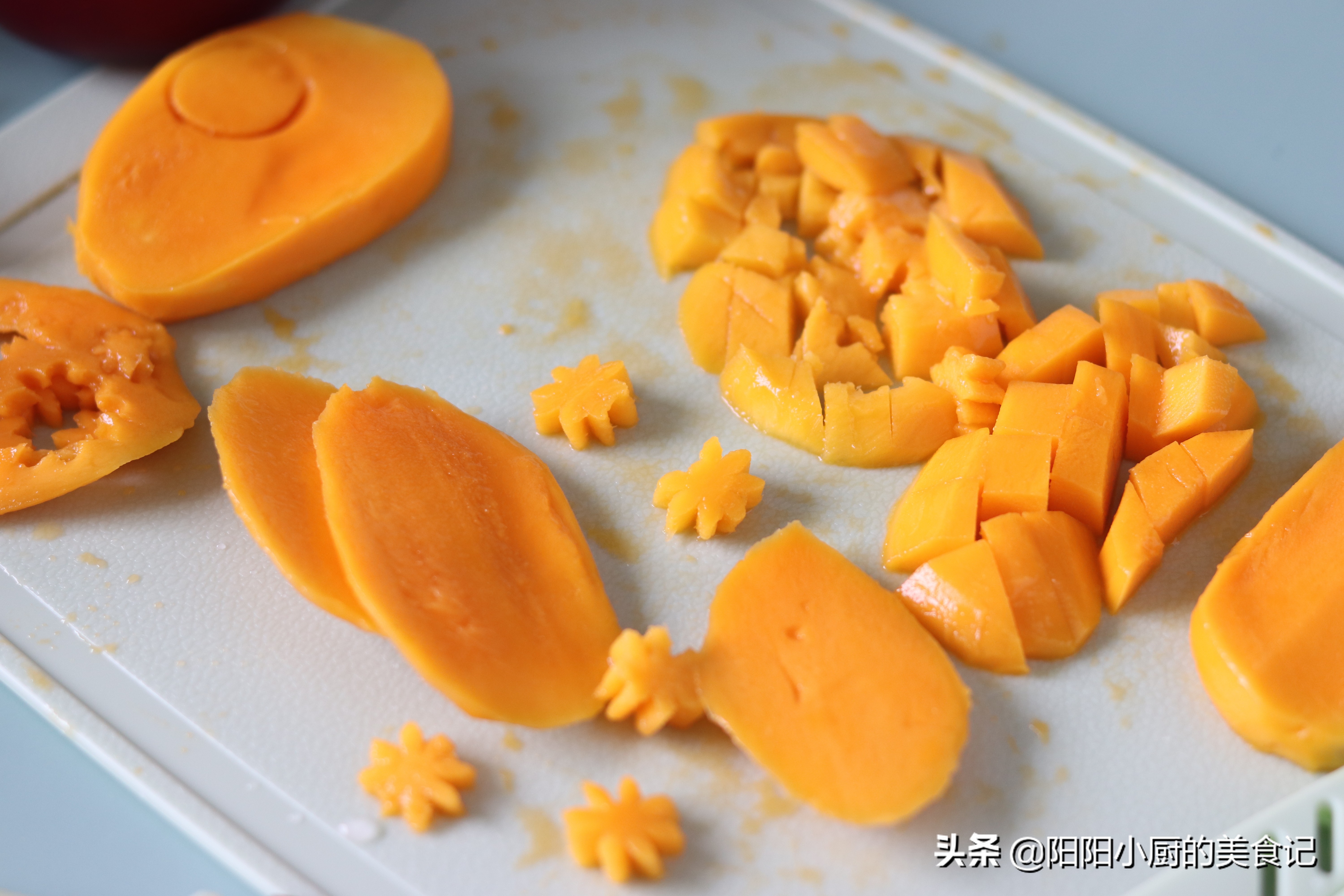 7、把芒果切成小块。还可以压出些小花,做装饰。