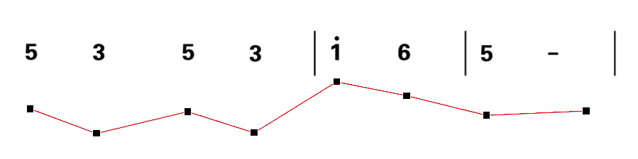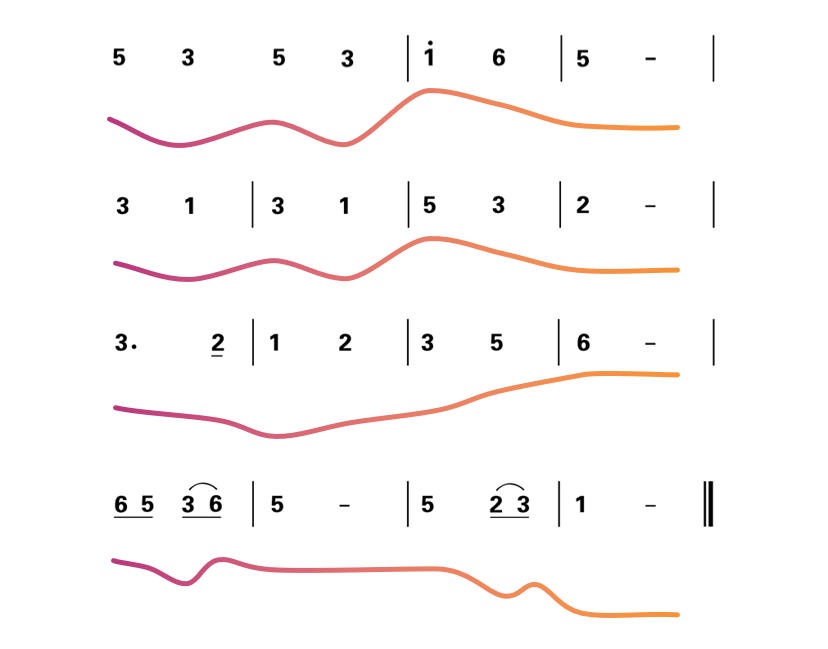 四个乐句的完整旋律线效果是下面这个样子。因为线条的格式是相同的,所以你可以先设置好一句旋律线的样式,然后用格式刷刷给其余三条: