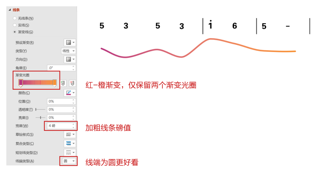 为了让旋律线更好看,我们可以为它设置颜色和一定的磅值(注意要设置线条颜色,而不是形状填充颜色)。