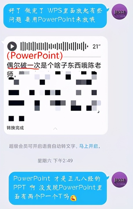 考虑到大部分老师对 Office 软件的认识极为有限,甚至根本分不清楚 PowerPoint 和 WPS(参考下面我和某小学老师的对话),这里我还是讲下 WPS 的做法……