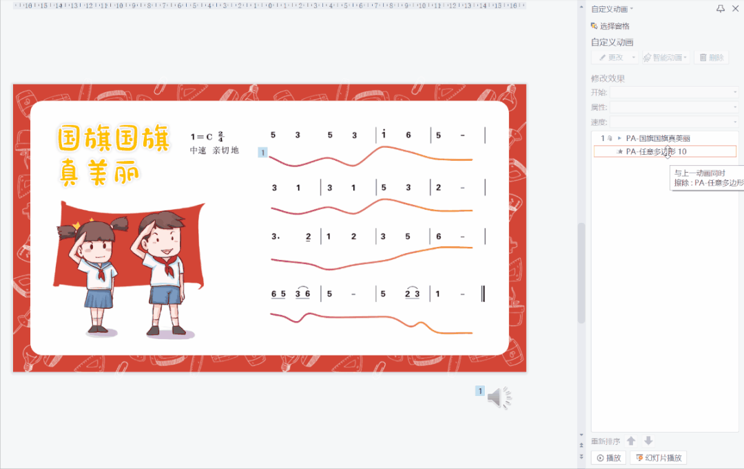 当然了,如果想要把效果做得更好,还可以加入一面小红旗,为它设置与旋律线一致的「自定义路径」动画,把它设置为和旋律线擦除动画一起播放,这样效果就更加丰富。