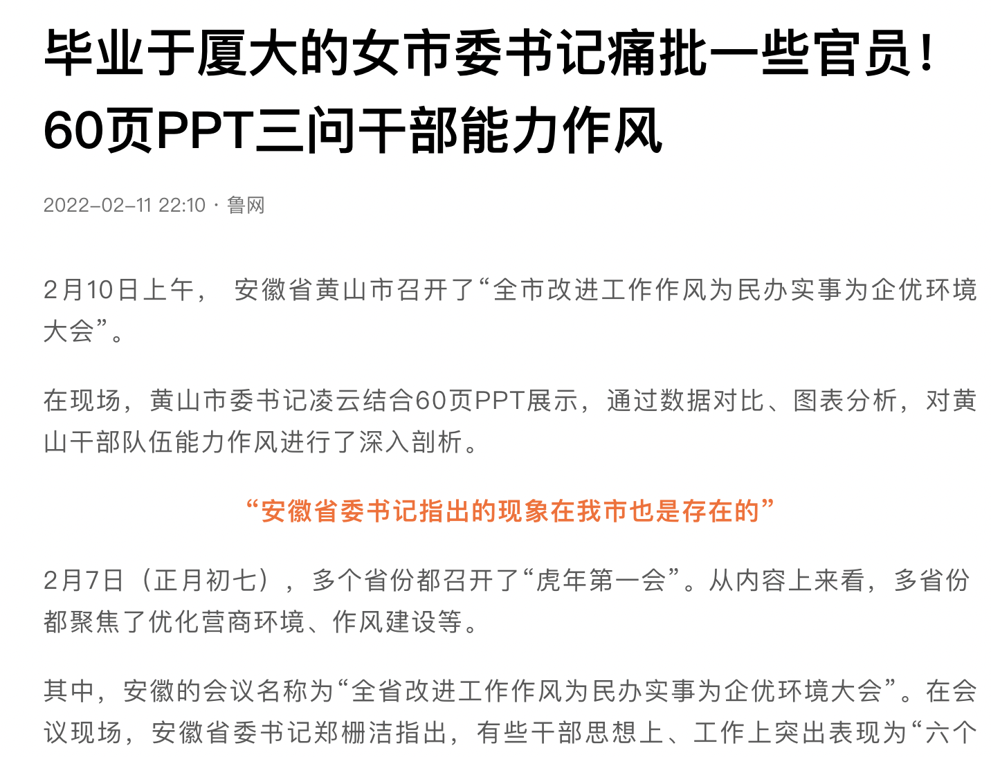 最近,安徽省黄山市一位女市委书记火了。 不是因为政绩,而是因为在“虎年第一会”上,她用了60页PPT来阐述目前该市的一些干部作风问题并深入剖析。有目标,有数据,有分析归因, 一句话,有理有据,属实是把开会这件事玩儿明白了。 过去我们总诟病机关单位的效率低下,典型的就是“文山会海”。 现在人家用上PP了。 要知道PPT向来是互联网企业的“祖传艺能”。大厂的筒子们想想是不是新年光拿开工红包了,你的组长,总监,VP有没有拿出60页PPT的精力和勇气刀口向内认真盘点属下不足?