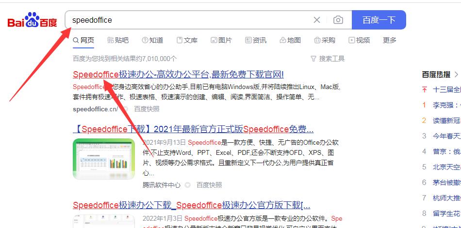 2、然后,在浏览器的搜索栏里面输入speedoffice,点击搜索,可以看到浏览器可以搜索相应官方office下载的网页。
