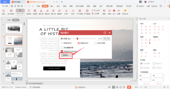 在弹出的“导出图片”窗口中,设置需要导出的幻灯片类型。选择完成后点击“另存为”。