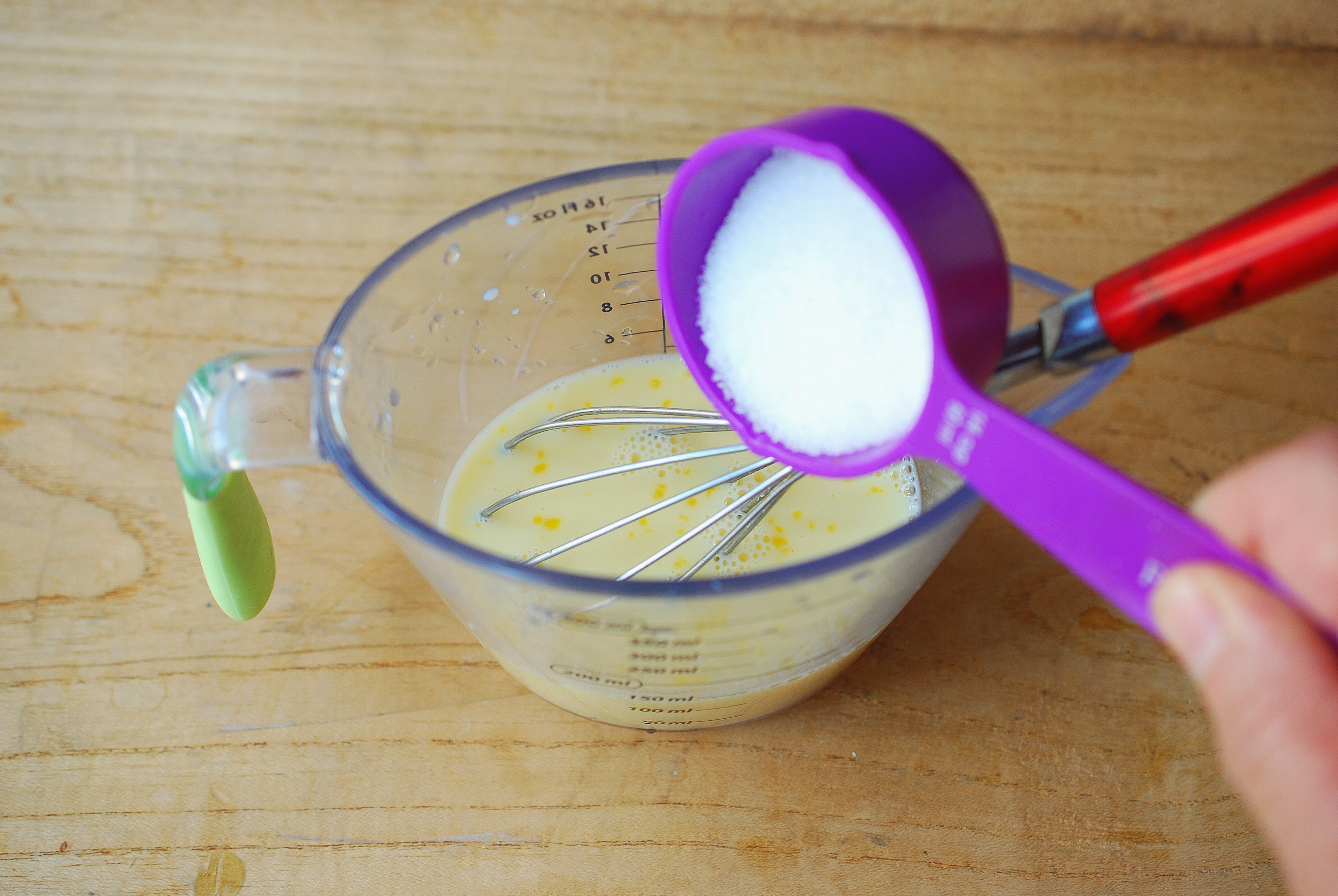 步骤四:量杯里继续放入白糖,再次搅拌均匀。用细砂糖或绵白糖最好,容易融化。