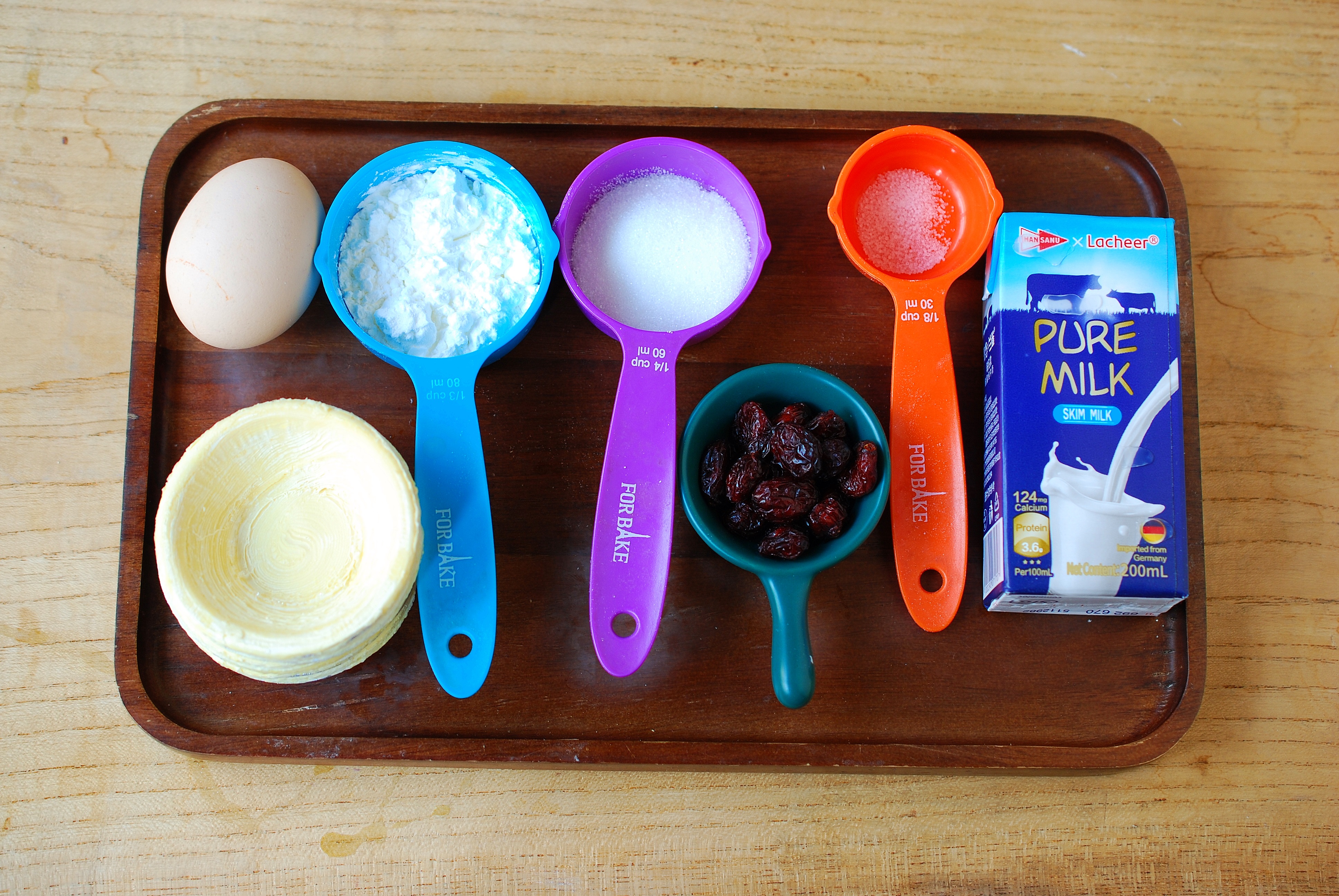 步骤一:准备好需要的食材,开始制作吧!蛋挞中我用到的是蔓越莓干,没有的话也可以用葡萄干代替。