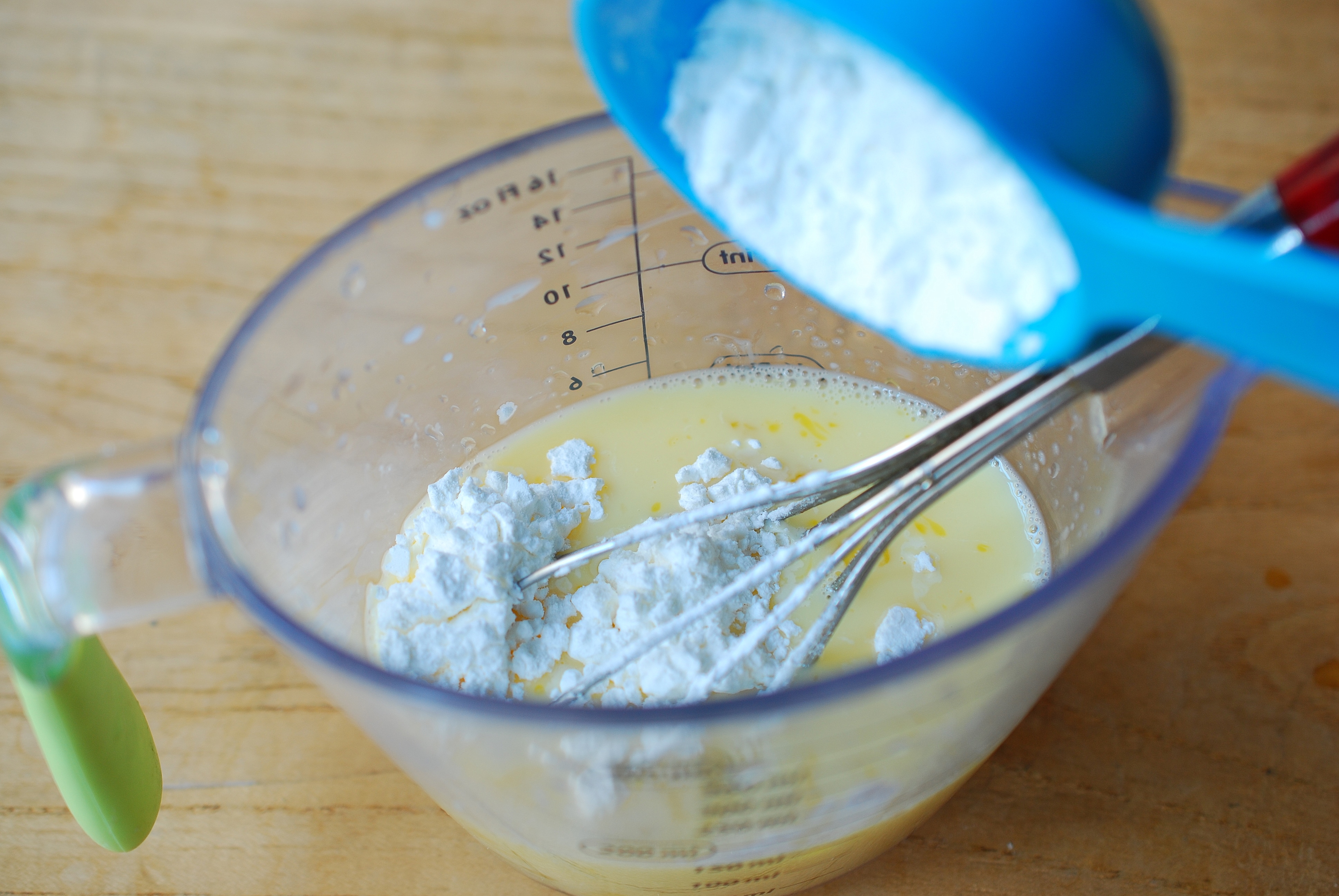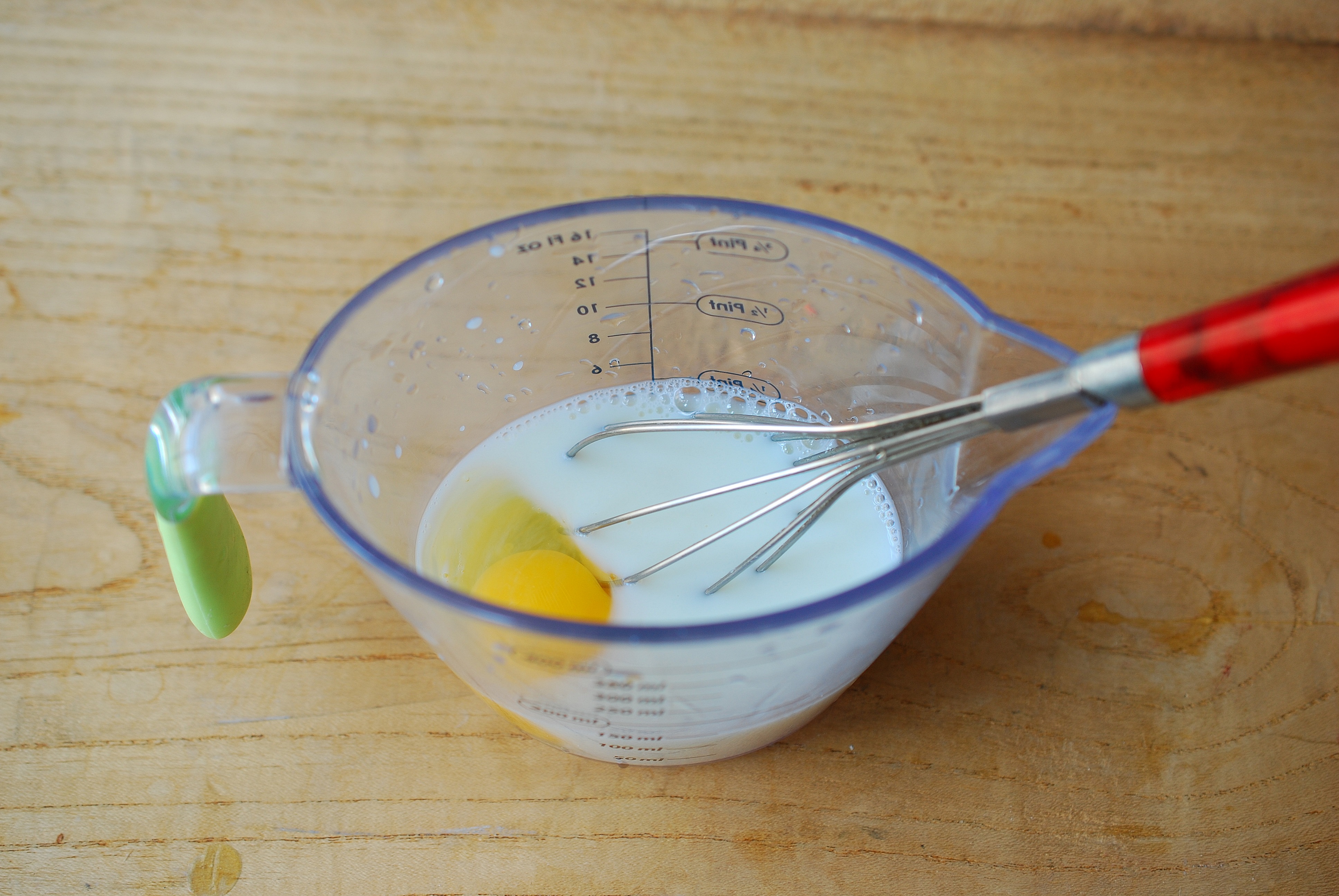 步骤三:现在开始做蛋挞液,量杯里打入一颗鸡蛋,加入牛奶,搅拌均匀。