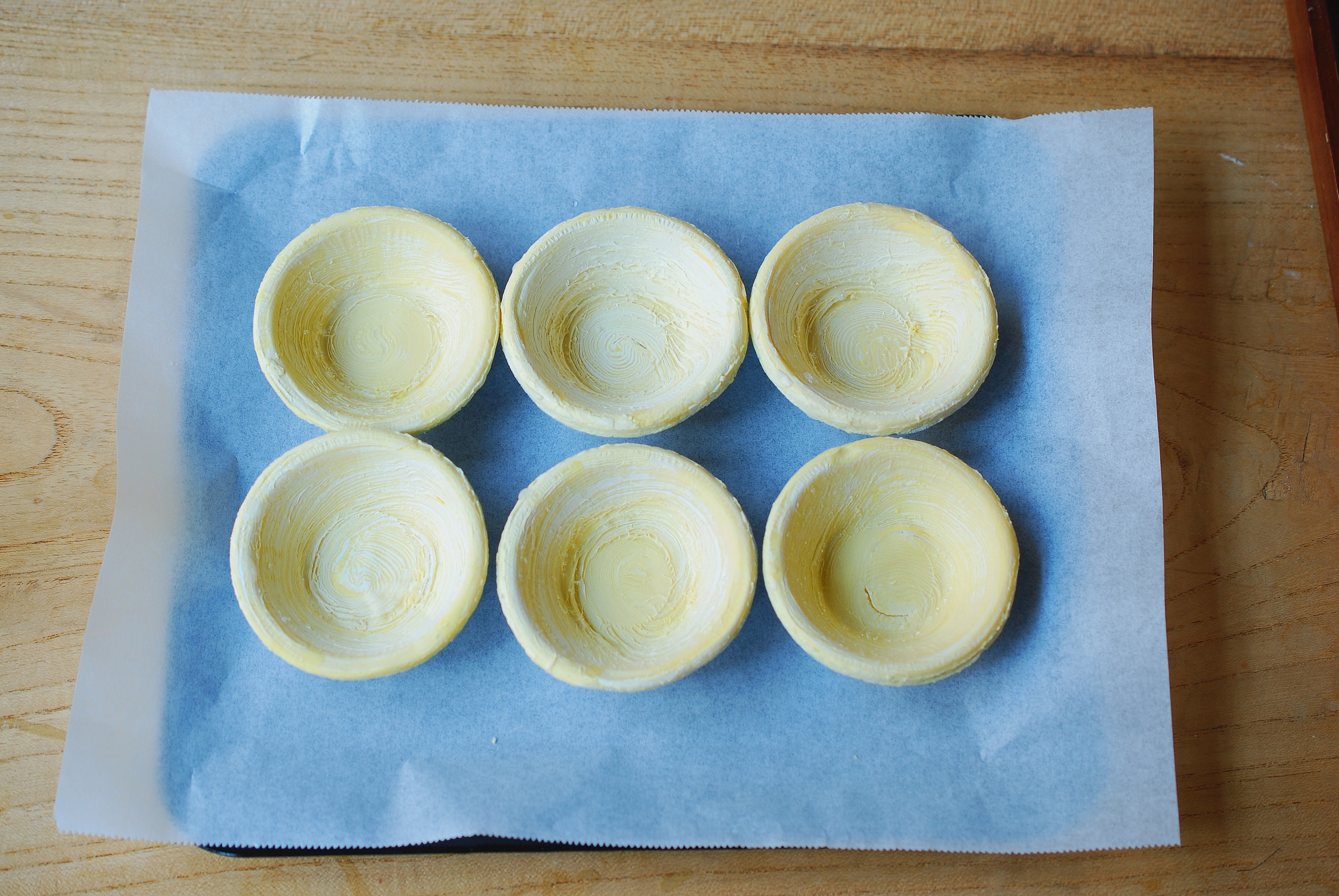 步骤二:取出冷冻的蛋挞皮,放在烤盘中,有些变形的,需要用手整理一下。
