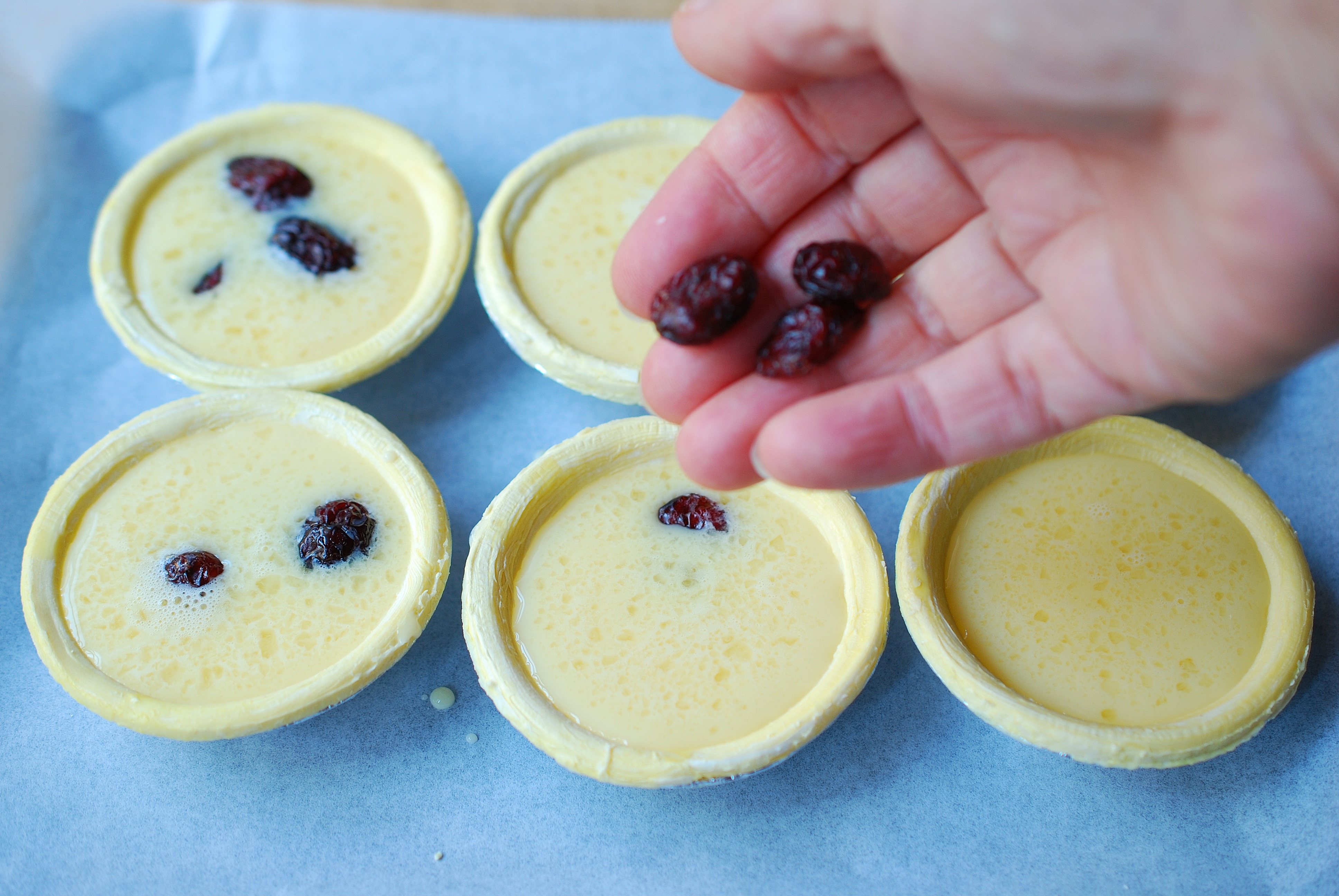 步骤六:用量杯可以很轻巧地将蛋挞液倒入蛋挞皮中,一点儿也不会洒出来。最后放入适量蔓越莓干或葡萄干。