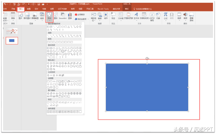 本次没有效果图,原因是本次是给大家教授一个PPT技巧,就是形状与字体的默认设置。正常情况下,我们在“插入”选项里插入一个“形状”,它的颜色是蓝色,线条是深一些的蓝色,所以每次我们都要去修改它的颜色和线条,默认的那种蓝并不是很好看。