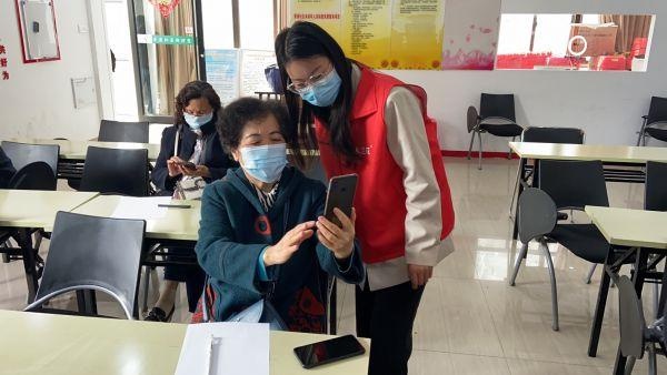 社区志愿者手把手教老人使用智能手机。邓倩 摄