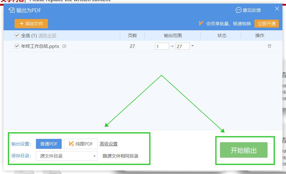接着在弹出的“输出为PDF”对话框中,我们设置一下里面的输出设置和保存目录 ,最后点击“开始输出”按钮就可以将PDF转换成PPT文件啦~不过这个方法转换出来的PPT文件质量不怎么好,大家注意一下。