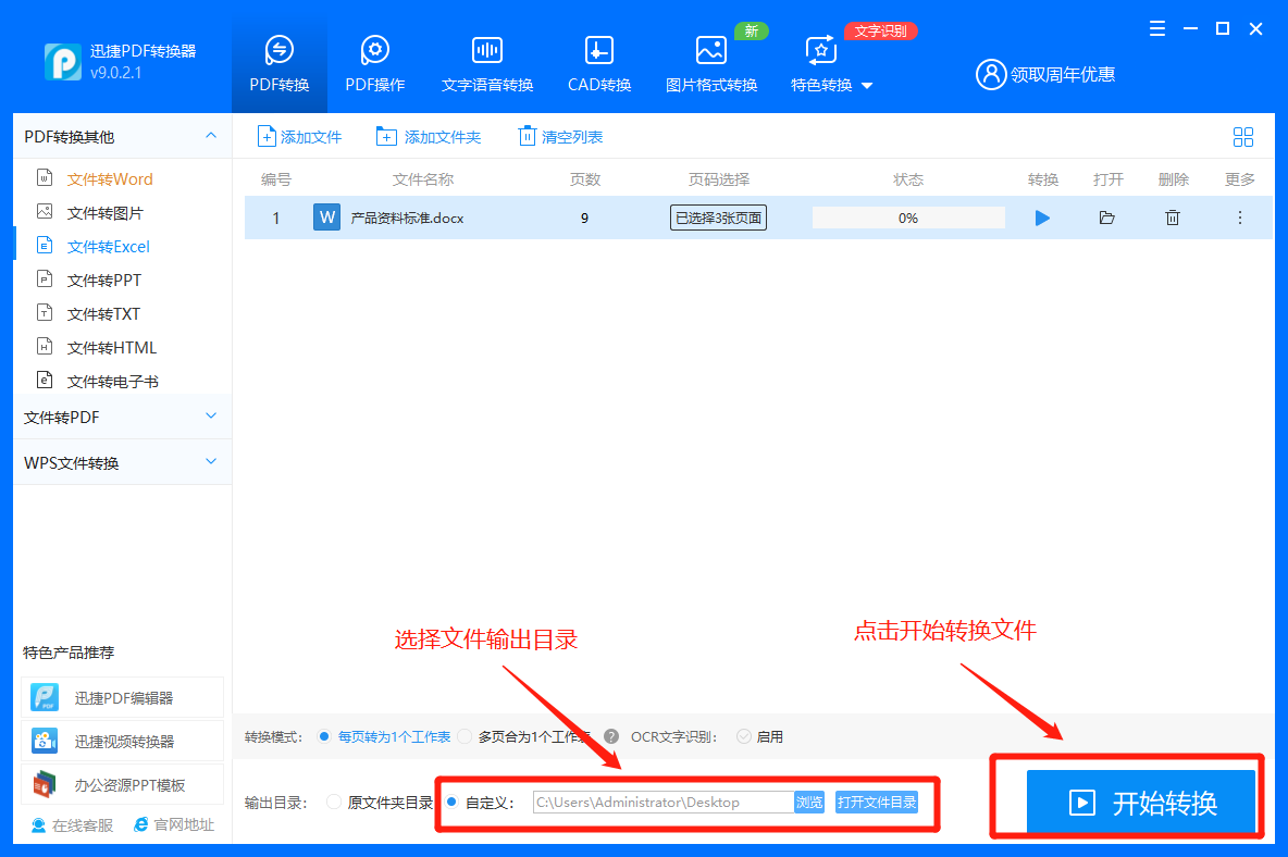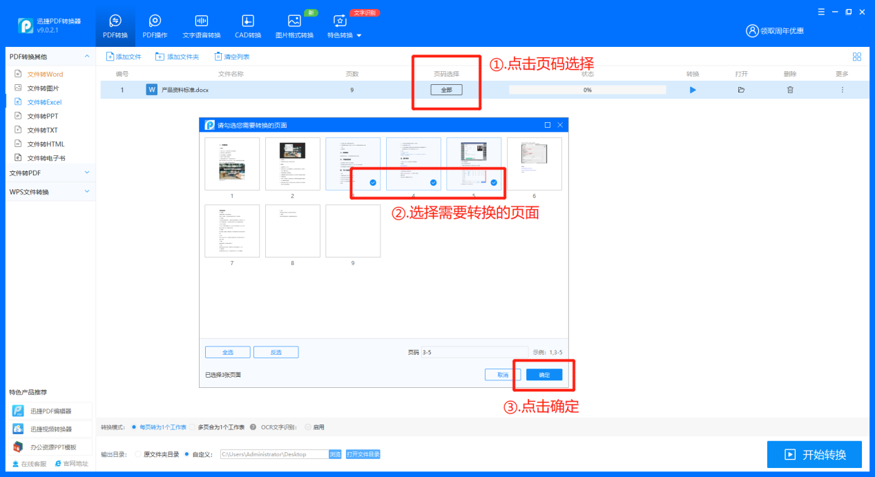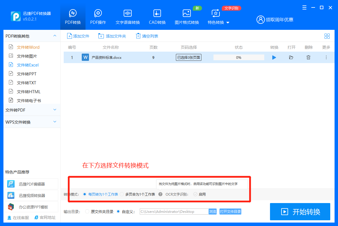 第四步:选择好转换页码之后在下方选择文件转换模式,可以设置每个页码单独转换一个工作表或者合并到一个工作表,如果Word文件里面有图片需要转换文字可以勾选【OCR文字识别】功能。