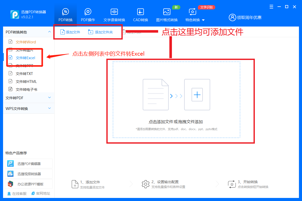 第二步:在左侧列表【PDF转换其他】里面点击【文件转Excel】按钮。然后在右方点击【添加文件】、【添加文件夹】或者点击下方虚线区域添加文件也可以把文件拖入到下方虚线区域。(这里不仅支持Word文档还可以添加PDF、PPT文件来转换)
