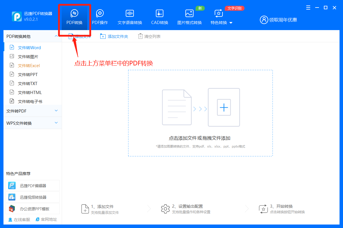 第一步:首先打开【迅捷PDF转换器】工具,在首页上方菜单栏中点击【PDF转换】按钮。