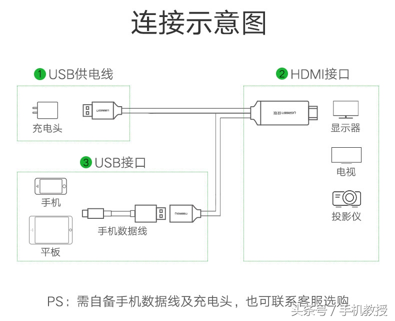 这里需要额外准备一个充电头、手机对应接口的数据线。