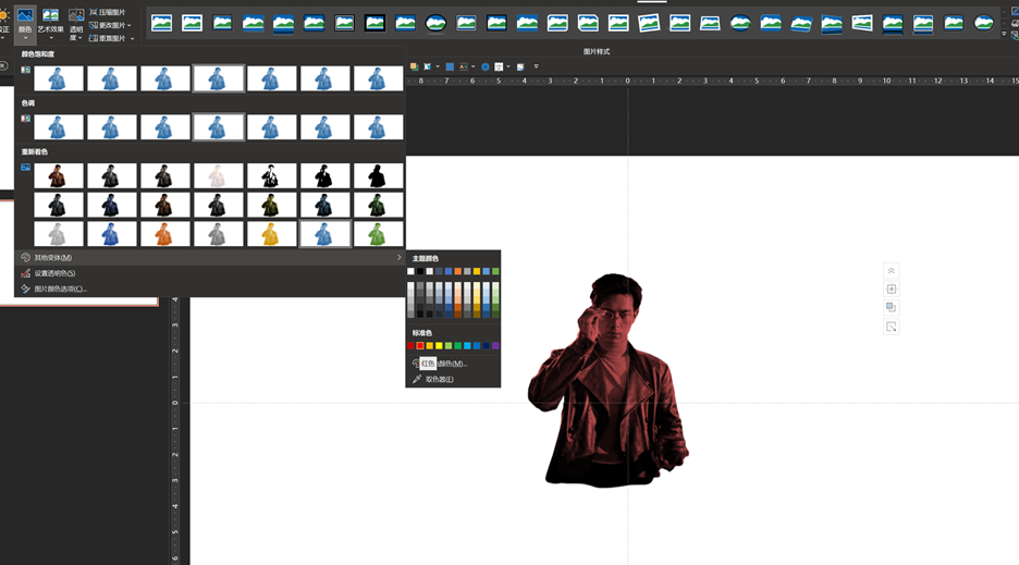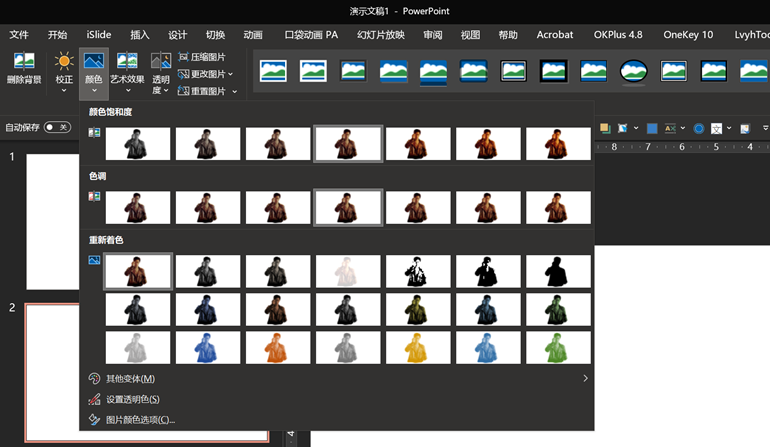 第二步,我们只需要使用PPT自带的重新着色功能即可。
