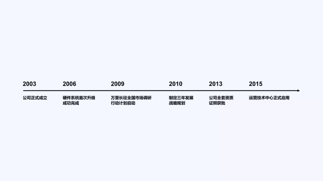 像个人述职、项目路演或者公司介绍的 PPT 中,大都会用时间轴页,来回首过去,让观众更加直观的了解自己或者公司的成长历程。就比如下面这些页面: